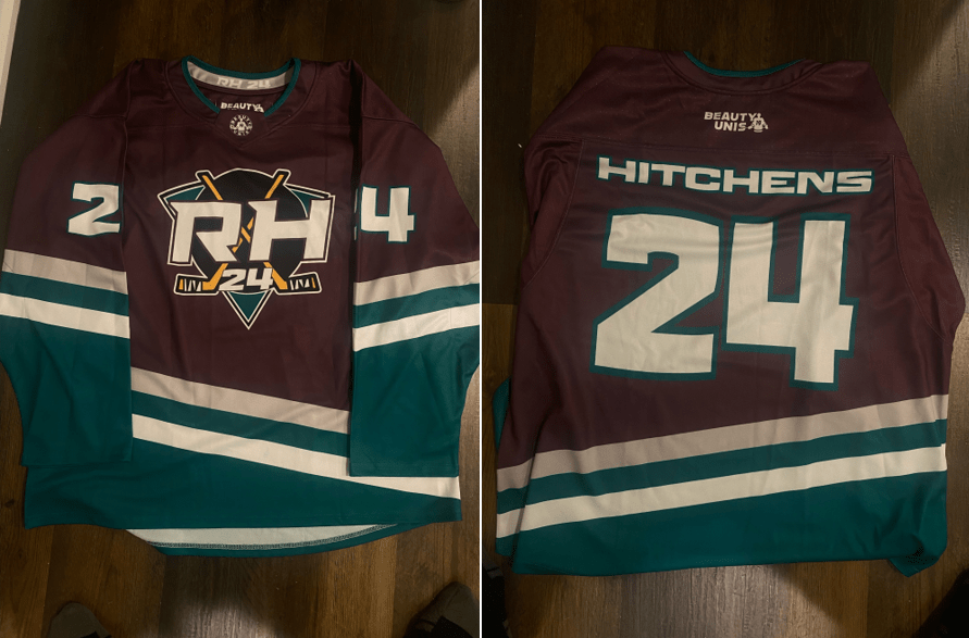Fast forward 8 years later, teammate Tyler Swift comes up with the idea of putting a team together for a tournament in honor of our teammate, Reese Hitchens, passing. Tyler and I started reaching out to guys, we all brainstormed design and team names, Schickling helped us get the jerseys. Deciding on jerseys with Reese’s initials (RH) on the front, and all of us wearing Reese’s number 24 and Hitchens on our backs. The name we came up for the team being Hitchens’ House since the tournament was played at our former home rink.